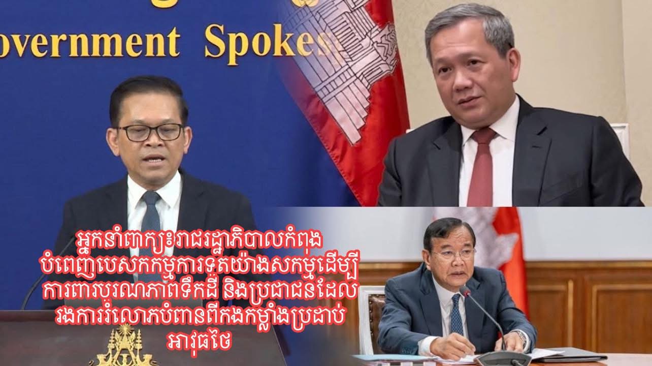 អ្នកនាពាក្យរាជរដ្ឋាភិបាលកម្ពុជា បានបញ្ជាក់ជាថ្មីថា រាជរដ្ឋាភិបាលកម្ពុជាក្រោមការដឹកនាំរបស់សម្តេចមហាបវរធិបតី ហ៊ុន ម៉ាណែត នាយករដ្ឋមន្ត្រីបាននិងកំពុងបំពេញបេសកកម្មការទូតយ៉ាងសកម្មនិងឥតឈប់ឈរ ទាំងក្នុងនិងក្រៅប្រទេស ដើម្បីការពារបូរណភាពទឹកដី និងប្រជាជនដែលរងការរំលោភបំពានពីកងកម្លាំងប្រដាប់អាវុធថៃ ក៏ដូចជាពង្រឹងស្មារតីសាមគ្គីជាតិឱ្យកាន់តែរឹងមាំក្នុងចំណោមប្រជាពលរដ្ឋខ្មែរនៅគ្រប់ទិសទី។