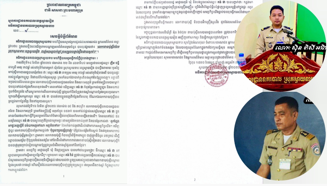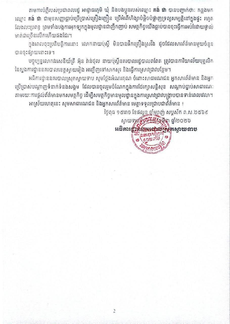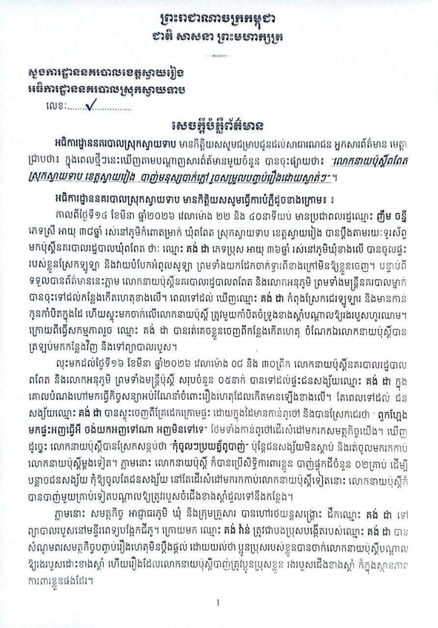 ស្វាយរៀង៖ អធិការដ្ឋាននគរបាលស្រុកស្វាយទាប នាថ្ងៃទី១៨ ខែមីនា ឆ្នាំ២០២៦នេះ បានចេញសេចក្តីបំភ្លឺដល់សាធារណជន ជុំវិញករណីលោកនាយប៉ុស្តិ៍ពពែត ស្រុកស្វាយទាប ខេត្តស្វាយរៀង បាញ់មនុស្សបាក់ភ្លៅ រួចសម្រួលបញ្ចប់រឿងដោយស្ងាត់ៗ ក្រោយពីមានសារព័ត៌មានមួយចំនួនបានចុះផ្សាយ។