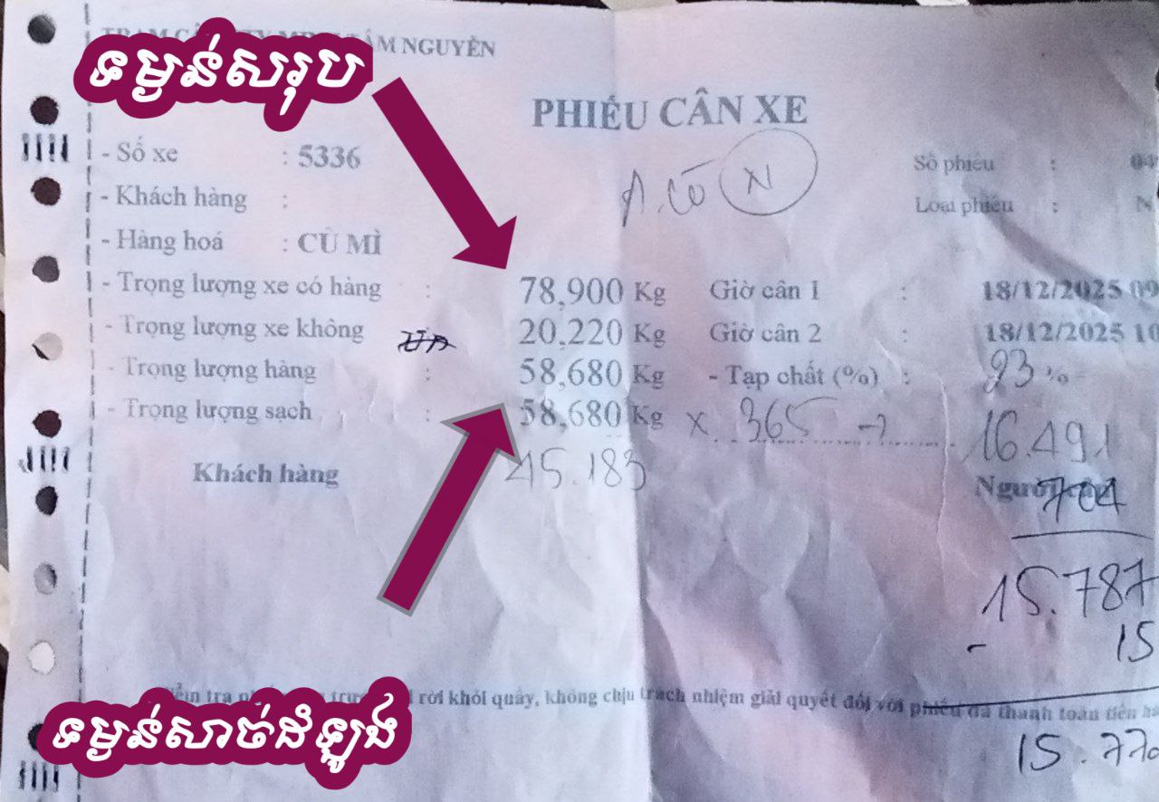 (ខេត្តត្បូងឃ្មុំ)៖ ក្រុមអ្នកដឹកដំឡូងមី ចេញពីកម្ពុជា ទៅលក់នៅប្រទេសវៀតណាម ដោយប្រើរថយន្តប្រភេទ(វ៉េអង)បានអះអាងថា ខ្លួនដឹក១ជើងៗ បង់លុយឱ្យ”ស្ថានីយថ្លឹងរថយន្តថ្នល់ទទឹង”នៅស្រុកត្បូងឃ្មុំ ខេត្តត្បូងឃ្មុំ អស់ចាប់ពី១០ម៉ឺនរៀល ទៅ១២ម៉ឺនរៀលក្នុង១ជើងជាកំហិត។