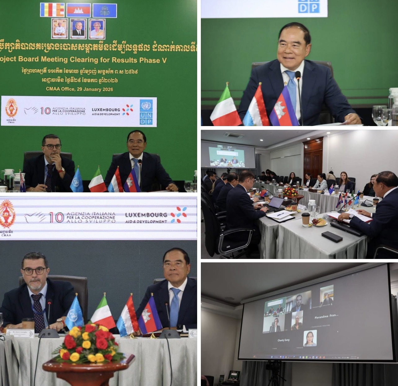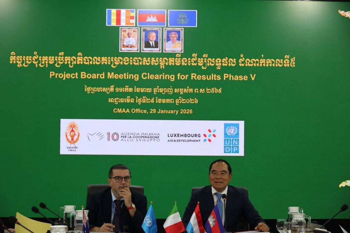 ភ្នំពេញ: នៅថ្ងៃទី២៩ ខែមករា ឆ្នាំ២០២៦ តាងនាមឱ្យ សម្តេចមហាបវរធិបតី ហ៊ុន ម៉ាណែត នាយករដ្ឋមន្រ្តី និងជាប្រធានអាជ្ញាធរមីន ឯកឧត្តមបណ្ឌិត លី ធុជ ទេសរដ្ឋមន្រ្តី និងជាអនុប្រធានទី១ អាជ្ញាធរមីន រួមជាមួយ លោក Enrico Gaveglia អ្នកតំណាងកម្មវិធីអភិវឌ្ឍន៍អង្គការសហប្រជាជាតិប្រចាំកម្ពុជា (UNDP) បានអញ្ជើញដឹកនាំកិច្ចប្រជុំលើកទី១ នៃក្រុមប្រឹក្សាភិបាលគម្រោងបោសសម្អាតមីនដើម្បីលទ្ធផលដំណាក់កាលទី៥ (CfR5)– សកម្មភាពមីនសម្រាប់ការអភិវឌ្ឍមនុស្ស ។