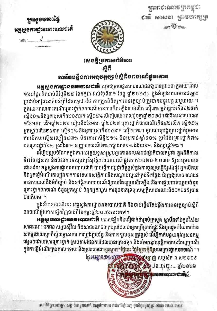 អគ្គស្នងការដ្ឋាននគរបាលជាតិ សូមជម្រាបជូនសាធារណជនឱ្យបានជ្រាបថា ក្នុងរយៈពេល ១៦០ថ្ងៃ (គិតចាប់ពីថ្ងៃទី២៥ ខែកក្កដា ដល់ថ្ងៃទី៣១ ខែធ្នូ ឆ្នាំ២០២៥) ក្នុងអំឡុងពេលមានជម្លោះ ប្រដាប់អាវុធនៅតំបន់ព្រំដែនកម្ពុជា-ថៃ ការត្រួតពិនិត្យការអនុវត្តច្បាប់ត្រូវបានបន្ធូរបន្ថយមួយរយៈ។