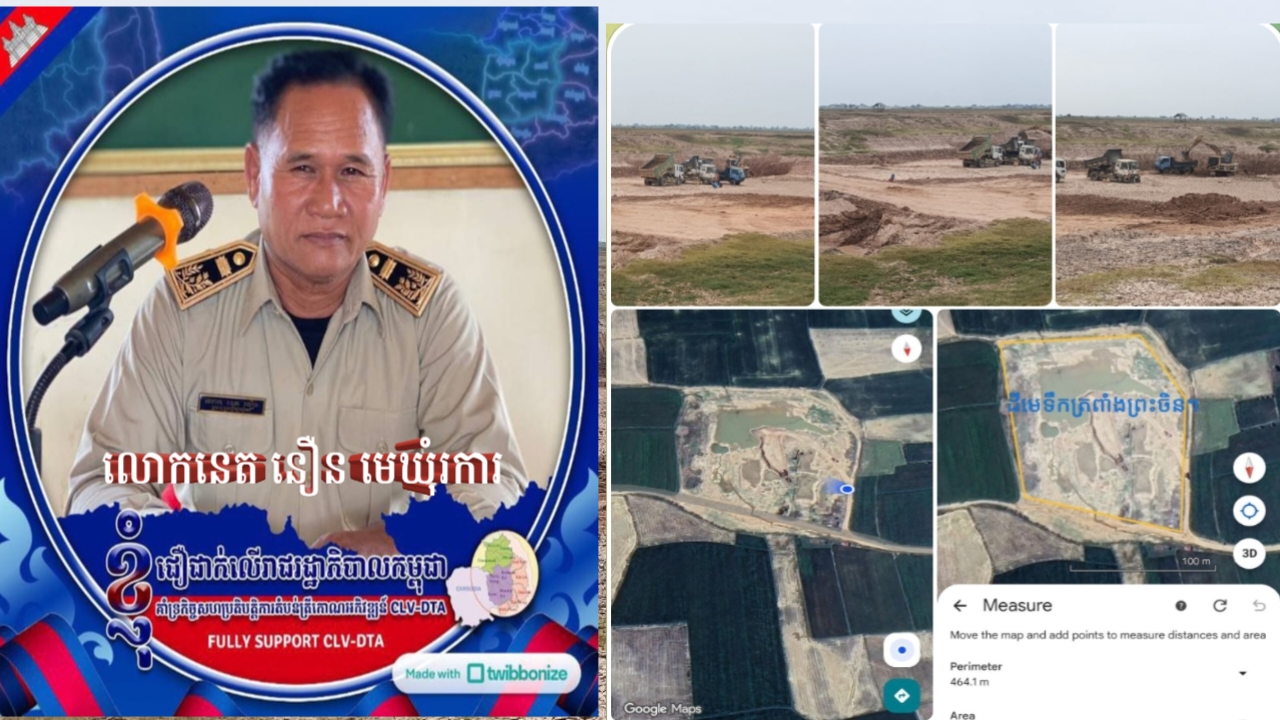 «ដីមេទឹកត្រពាំងព្រះចិននេះ ស្ថិតក្នុងភូមិត្នោត ឃុំរកា ស្រុកពារាំង ខេត្តព្រៃវែង»។ប្រភពពីពលរដ្ឋបានឱ្យដឹងថា៖ម្ចាស់គ្រឿងចក្រដ៏មហិមាមានឈ្មោះសុង ហេង ដែលមានទីលំនៅស្រុកពារាំងនេះតែម្តង។បច្ចុប្បន្នលោកសុង ហេង បានដាក់គ្រឿងចក្រជីកកកាយរណ្តៅជ្រៅៗ ដីមេទឹកត្រពាំងព្រះចិន ដែលជាដីសាធារណៈរបស់រដ្ឋ យកអាចម៌ដីលក់ជាប្រយោជន៍ផ្ទាល់ខ្លួន។បណ្ដាលឱ្យស្ថានភាពដីមេទឹកត្រពាំងព្រះចិន ក្រហេងក្រហូងកន្លែងខ្លះមានជម្រៅជិត១០ម៉ែត្រឯណ្ណោះ។