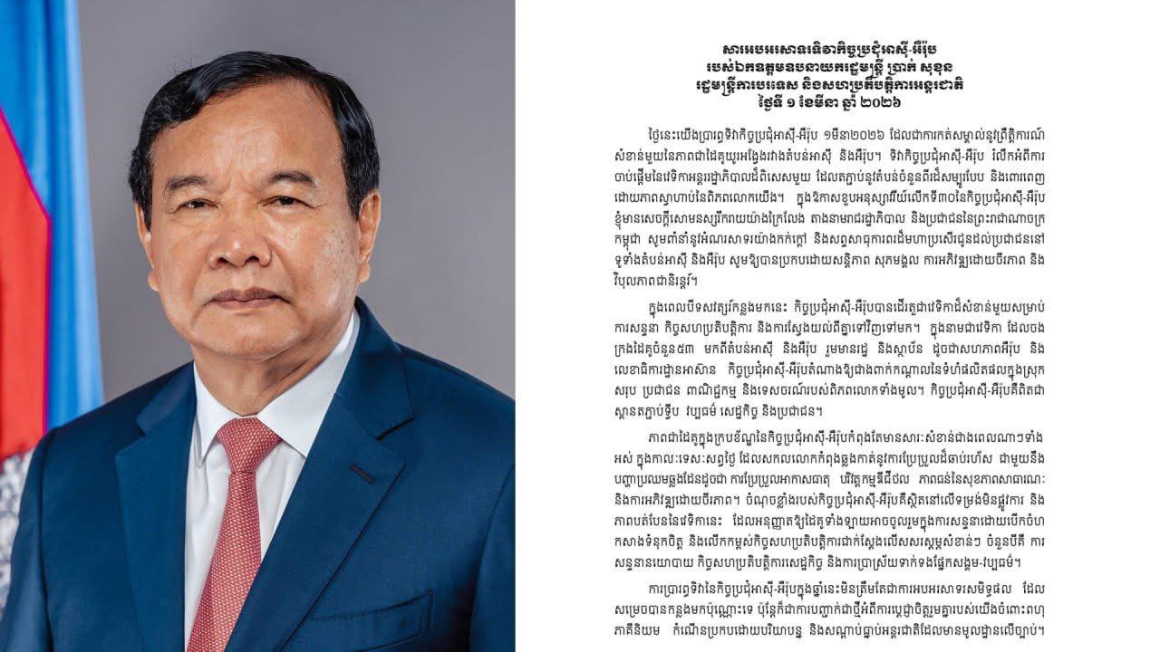 ភ្នំពេញ៖ឯកឧត្តមឧបនាយករដ្ឋមន្ត្រី ប្រាក់ សុខុន រដ្ឋមន្ត្រីការបរទេស និងសហប្រតិបត្តិការអន្តរជាតិ បានផ្ញើសារ អបអរសាទរទិវាកិច្ចប្រជុំអាស៊ី-អឺរ៉ុប នៅថ្ងៃទី១ ខែមីនា ឆ្នាំ ២០២៦នេះ ខណៈកិច្ចប្រជុំនេះគឺជាស្ពានតភ្ជាប់ទ្វីប វប្បធម៌ សេដ្ឋកិច្ច និងប្រជាជនប្រទេសជាដៃគូរចំនួន ៥៣ មកពីតំបន់អាស៊ី និងអឺរ៉ុប។