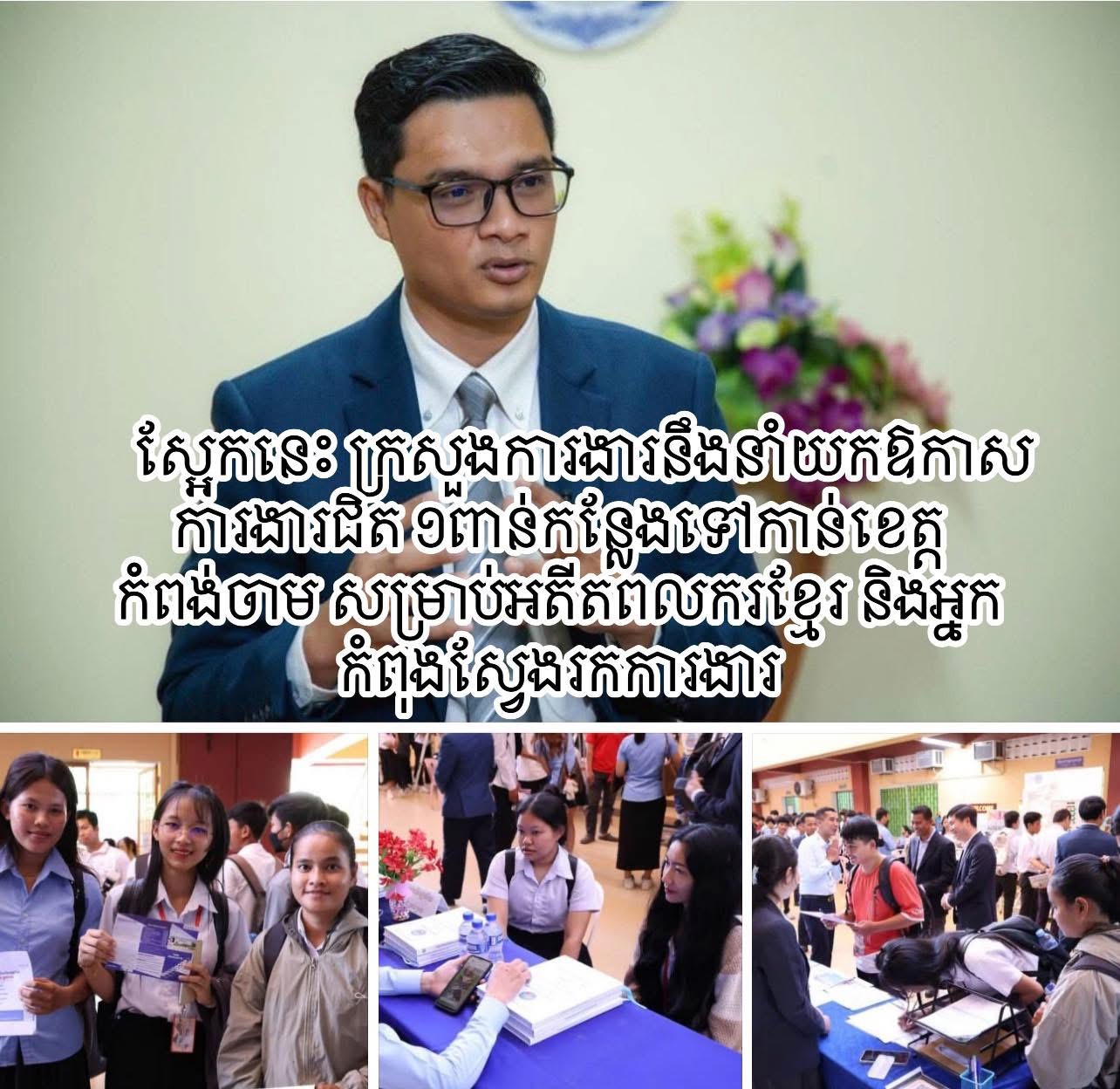 កំពង់ចាម: ក្រសួងការងារ និងបណ្តុះបណ្តាលវិជ្ជាជីវៈ គ្រោងនាំយកឱកាសការងារសរុបចំនួន ៩១៩ កន្លែងតាមរយៈ«វេទិកាការងារ និងយុទ្ធនាការចុះឈ្មោះអ្នកសេដ្ឋកិច្ចក្រៅប្រព័ន្ធ» ទៅកាន់ខេត្ដកំពង់ចាម សម្រាប់អតីតពលករខ្មែរ និងអ្នកកំពុងស្វែងរកការងារ ដែលរៀបចំនៅថ្ងៃទី ១២ ខែមីនា ឆ្នាំ២០២៦ នៅវិទ្យាស្ថានពហុបច្ចេកទេសខេត្តកំពង់ចាម។